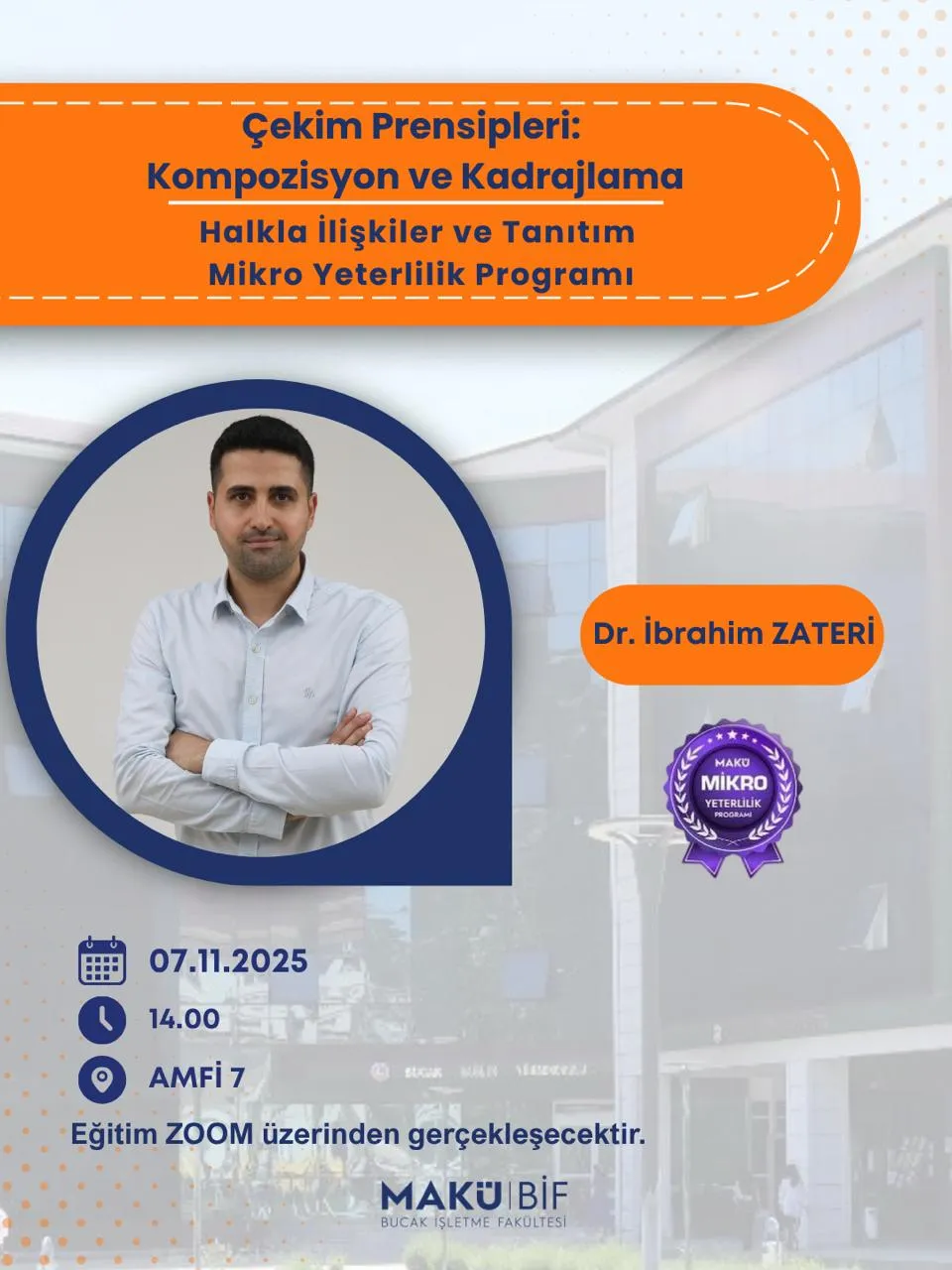 The course titled “Shooting Principles: Composition and Framing” by Dr. İbrahim ZATERİ will be held online at 14:00 in Amphitheater 7.